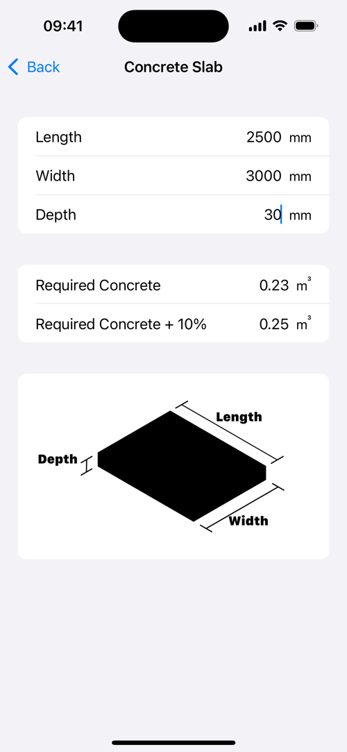 The app allows you to input the correct dimensions, such as diameter, height, length and width. The app also will allow you to input measurements in either the metric or imperial system. Regardless of whether you prefer millimetres and centimetres or feet and inches, our concrete calculator is able to work the way you like to work.
